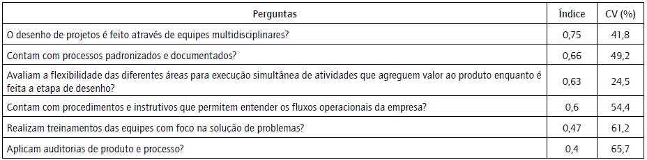 Em contrapartida, o índice com menor avaliação nessa etapa possui o maior coeficiente de variação, o que indica que as empresas são bastante heterogêneas quando se trata do uso de programas de incentivo que promovam a execução eficiente de cada fase do projeto. Os entrevistados que asseguraram contar com esse tipo de programa destacaram que, entre os métodos para incentivar os colaboradores, está a oferta de brindes e bonificações, portanto asseguraram que todos os membros que participam dos projetos mostram interesse e envolvimento, uma vez que os ganhos e as bonificações são coletivos. Além disso, deixaram claro que essas ações estimulam os colaboradores a se empenharem mais nas suas atividades diárias.