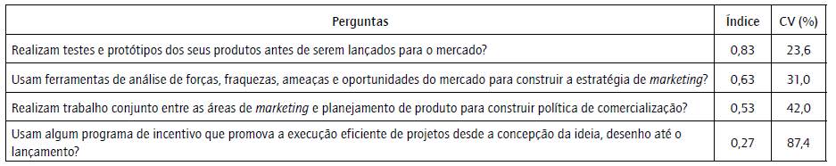 O índice com a maior avaliação da etapa "implementar-lançar", apresentado na Tabela 7, refere-se à implementação de testes de novos produtos antes do seu lançamento ao mercado, o que permite evidenciar que as empesas se preocupam pela estratégia de inserção de novos produtos no mercado, com vistas à diminuição de custos de redesenho, a reembolsos por garantias e não conformidades, à reputação da marca e à facilidade de rastreabilidade em falhas do produto. Além disso, o coeficiente de variação desse fator é o menor dessa etapa, o que mostra homogeneidade nas atitudes da empresa em relação à entrega de seus produtos aos clientes e indica que esse fator é uma preocupação comum das diferentes empresas.