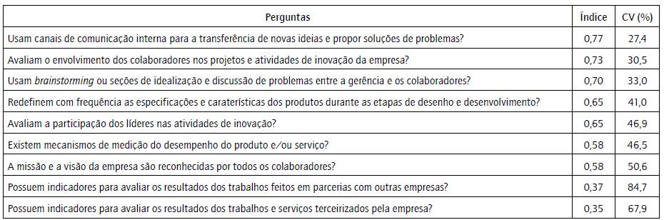 Na Tabela 8, para o caso da etapa "implementar-sustentar", o índice com a melhor avaliação refere-se ao uso de canais de comunicação interna que facilitem a transferência de novas ideias e a proposta de soluções aos problemas comuns. Considera-se o coeficiente de variação baixo, o que confirma que as empresas correspondem homogeneamente nessa questão. Essa observação é relevante, pois a comunicação é parte essencial no desenvolvimento do negócio e facilita a formulação de soluções apropriadas para os problemas da empresa. Porém, nenhuma dessas empresas mencionou o procedimento ou mecanismo de comunicação que garantisse a transferência de ideias, como por exemplo, seções tipo focus group, convocatórias internas etc.