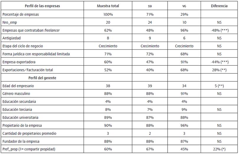 En la tabla 1 se muestran las estadísticas que describen el perfil de las empresas encuestadas de cada uno de los sectores estudiados. En primer lugar, como una medida del tamaño de la empresa, se observa el número promedio de empleados (Nro_emp). Las empresas de SSI tienen en promedio 24 empleados y las de VC posee n en promedio 10 empleados. Dicha diferencia no resultó ser significativa.