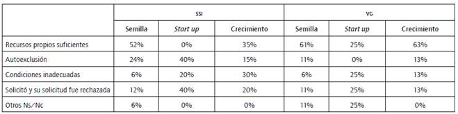 No sucede lo mismo en la etapa de start up, donde la opción de recursos propios suficientes es considerada por pocas empresas en el subsector de VC y en ninguna en el sector SSI, es decir, para todas las empresas la decisión de utilizar fondos propios únicamente viene impuesta por las restricciones al financiamiento externo. En las empresas del subsector de SSI, las principales razones de utilizar solo recursos propios son la autoexclusión y el rechazo de la solicitud. En el caso de las empresas de VC son el rechazo de la solicitud y las condiciones inadecuadas.