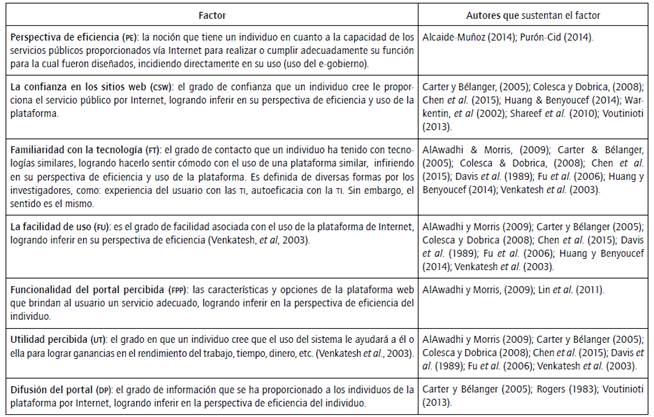 Se reconocen cuatro factores más, partiendo de diferentes nociones de investigaciones recientes en materia de uso y aceptación de la tecnología gubernamental (AlAwadhi & Morris, 2009; Carter & Bélanger, 2005; Colesca & Dobrica, 2008; Chen et al., 2015; Huang & Benyoucef, 2014; Shareef et al., 2010; Voutinioti, 2013). Estos factores se eligen de acuerdo con la percepción de los autores y el reconocimiento de expertos en la materia, quedando declarados los siguientes: la confianza en los sitios web, la familiaridad con la tecnología, la funcionalidad del portal y la difusión del portal, que se relacionan con la perspectiva de eficiencia ciudadana.