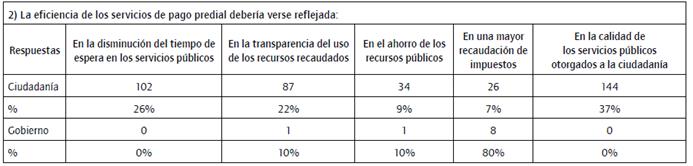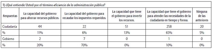 De los funcionarios encuestados, se obtuvo que la eficiencia de la administración pública es reflejada en "la capacidad del gobierno para recaudar los impuestos requeridos", es decir, la eficiencia es un asunto económico, contrastado contra los ciudadanos que respondieron en su mayoría que la eficiencia de la administración pública es "la capacidad que tiene el gobierno para atender las necesidades de la ciudadanía en tiempo y forma" (tabla 4); por lo tanto, se corrobora la existencia de dos perspectivas de eficiencia diferentes.