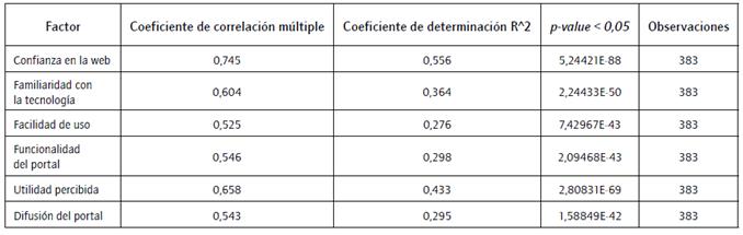 Además, los resultados sugieren que existe una correlación de cada uno de los factores señalados con la perspectiva de eficiencia ciudadana, lo que permite comprobar positivamente todas las subhipótesis que van de la H1(a) a la H1(f). Por lo tanto, se establece que la confianza en la web es el factor más fuerte, con un coeficiente de correlación múltiple de 0,745, lo que demuestra que la perspectiva de eficiencia ciudadana es determinada en un mayor grado por esta variable, seguida de la utilidad percibida con un 0,658.