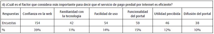 Estos valores son reforzados de forma descriptiva a través de la siguiente pregunta: ¿Cuál es el factor que considera más importante para decir que el servicio de pago predial por Internet es eficiente? El 39% de los encuestados indicaron que el factor número uno para considerar eficiente al servicio de pago predial por Internet es la confianza en la web, seguido de la facilidad de uso, la funcionalidad del portal y la utilidad percibida (tabla 8).