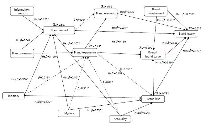 The following assumptions are proposed according to the conceptual contributions approached. For Roberts (2005, 2006), intimacy, mystery, and sensuality are the main elements for both brand respect and brand love (Blackston, 2018). Brand awareness (Çifci et al, 2016; Lambin & Tesser, 2004) affects brand experience (Al-Mandil & Yen, 2017; Brakus et al, 2009) because of brand value. Besides, brand loyalty (Malik & Guptha, 2013; Pritchard & Howard, 2015; So., 2016) depends on brand respect, brand love, brand vale, brand elements (Alnsour & Subbah, 2018; Keller, 2001, 2017; Fernández, 2015), and brand involvement (Cho et al, 2015; Muniz & O'Guinn, 2001; Muniz & Schau, 2005; Sung & Choi, 2010; Wang, 2002; Zaichkowsky, 1985).