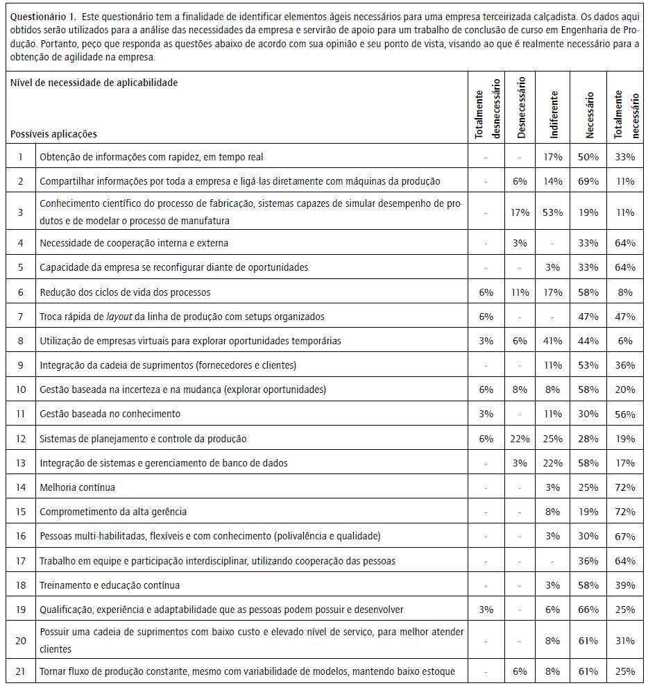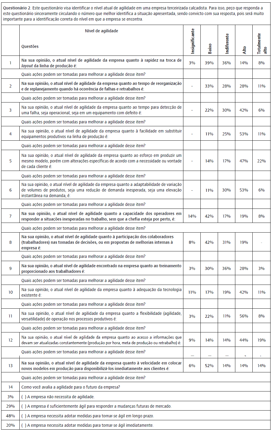 Esta pesquisa apresentou os resultados de um estudo exploratório que teve como objetivo propor um método sob a perspectiva da MA, para definir a estratégia de manufatura de uma empresa terceirizada do setor calçadista. Com os resultados obtidos na pesquisa, foi possível apontar que o método de estratégia melhorou o desempenho da empresa. Como a empresa analisada não possuía uma estratégia de manufatura formalmente estabelecida, os processos para confrontar os efeitos indesejáveis (figura 2) presentes em sua estrutura eram mal elaborados. Dessa maneira, a partir da revisão teórica, foram elaborados dois questionários que identificaram o nível atual de agilidade e as necessidades de agilidade interna à empresa. As respostas foram interpretadas e, assim, elaborado o método, a fim de atender aos objetivos estratégicos da MA.