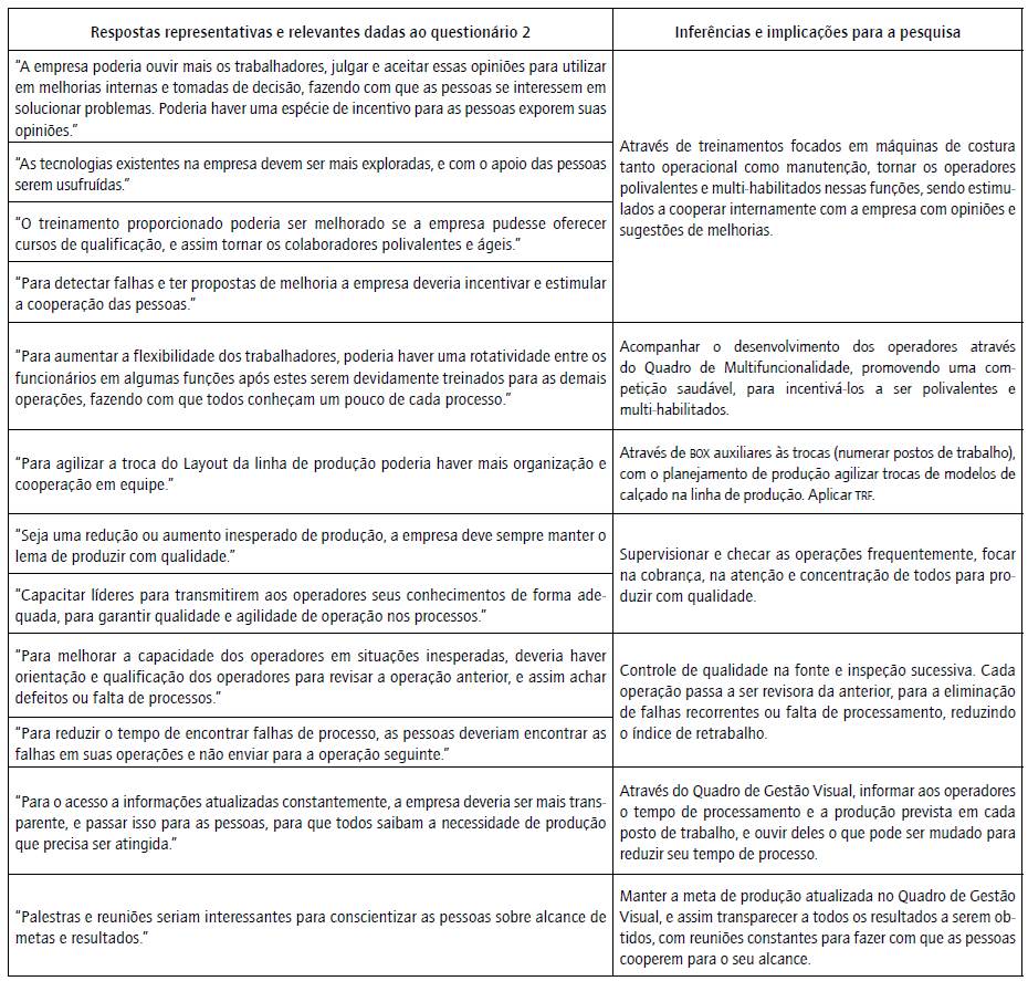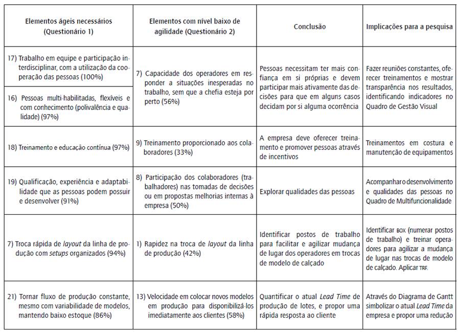 A partir dos resultados da Tabela 4, é possível sugerir que, para atender aos resultados positivos obtidos, o capacitador MA relacionado às pessoas foi o mais difundido no âmbito da empresa com a implantação do modelo. Para Gunasekaran (1999), é importante os colaboradores sejam polivalentes e multi-habilitados para assegurar um ambiente ágil. Entretanto, o fator primordial é a qualificação, a experiência e a adaptabilidade que as pessoas podem possuir e desenvolver. Essa lacuna foi compreendida com a capacitação e o acompanhamento da evolução das pessoas no quadro de multifuncionalidade. Assim como no estudo de Lopes et al. (2007), o presente estudo conseguiu atender o objetivo da TRF, ou seja, reduziu o tempo de setup de uma linha produtiva de calçados para abaixo de 10 minutos.
