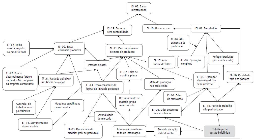 Então, a estratégia de gestão indefinida foi a causa raiz encontrada, visto que antecede 70% do total dos efeitos indesejáveis presentes na ARA, figura 2. A estratégia de gestão indefinida simboliza a informalidade da existência de uma estratégia de manufatura.