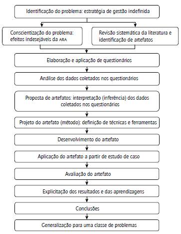 O método de trabalho proposto tem por finalidade encontrar as variáveis que interferem na formação do problema e na busca da sua solução. Na figura 3, está apresentada a metodologia seguida neste projeto baseada na Design Science Research (Dresch, 2013). O método de trabalho iniciou com a identificação do problema, a partir da aplicação da ARA na empresa analisada. A conscientização do problema por parte da alta gerência ocorreu com a avaliação dos efeitos indesejáveis inerentes à ARA. Paralelamente a isso, o pesquisador consultou bases de conhecimento científico para identificar elementos ligados à MA, úteis ao objetivo do projeto de pesquisa.