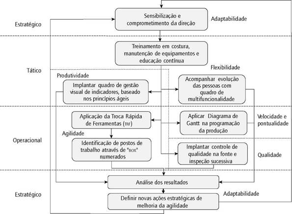 El propósito del estudio es proponer y aplicar un método de estrategia de manufactura para una empresa tercerizada del sector de calzados, basado en presupuestos de la Agile Manufacturing. Se trata de una investigación de carácter bibliográfico, apoyada en la Design Science Research, la que plantea un nuevo artefacto fundamentado en la revisión de la literatura y que se aplica desde el estudio de caso. Se utilizan encuestas como técnica de recolección de datos y análisis de contenido como técnica para analizar las informaciones. La investigación plantea un método de aplicación customizado para la empresa en estudio, con el fin de seguir un proceso lógico de mejoramiento continuo. El método considera los objetivos estratégicos abordados por la Agile Manufacturing y aplica herramientas específicas. Como resultados, durante el periodo analizado, hubo reducción del 52% en el índice de retrabajo, del 74% en el tiempo de setup y del 41% en el lead time. También se obtuvieron ganancias en eficiencia, productividad y puntualidad. El estudio presenta un método único en la teoría que puede emplearse por otras empresas, lo que contribuye para lograr un entorno ágil.