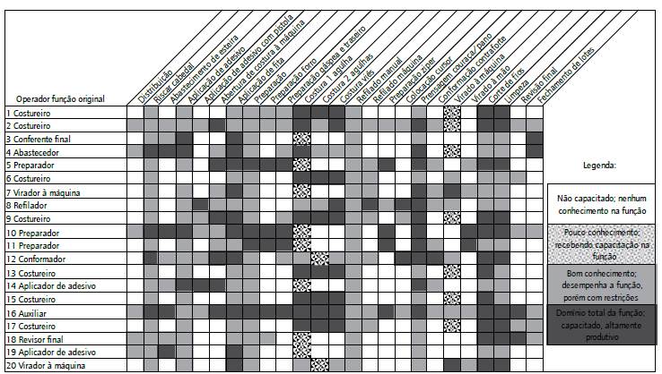 A evolução das pessoas passou a ser monitorada no Quadro de Multifuncionalidade à medida que é relacionado o conhecimento de cada colaborador para cada função existente dentro da empresa. Esse quadro, apresentado na figura 6, passou a ser atualizado mensalmente e fica sob os cuidados da direção da empresa que, tanto acompanha o desenvolvimento da capacitação como o utiliza para fazer a gestão de cargos e salários para cada colaborador.