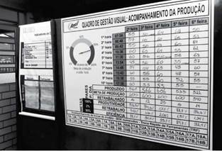 Foi elaborado um quadro de gestão visual para acompanhar indicadores da produção, tais como produtividade, eficiência, retrabalho e meta de produção. Esse quadro (figura 7) é atualizado pelo responsável do fechamento de lotes a cada hora e, por meio de um dashboard manual, possibilita que todos tenham conhecimento e visibilidade do alcance da meta. Colaboradores foram capacitados em conversas e reuniões para entender o quadro e comprometer-se com o alcance da meta estabelecida.