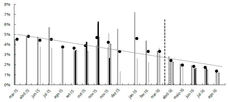 Os modelos de calçados foram subdivididos em famílias de produtos, conforme a semelhança e o grau de elaboração, considerando as alterações no portfólio de produtos que ocorrem ao longo do ano, de acordo com as novas campanhas de vendas e das estações do ano. Assim, comparando o período em que iniciou o controle de qualidade na fonte e a inspeção sucessiva, de março a agosto de 2016, com o período do ano anterior, de março a agosto de 2015, percebe-se uma queda de 52,4% no índice de retrabalho total. A figura 8 demonstra a redução do índice de retrabalho devido à intervenção realizada a partir de abril de 2016.