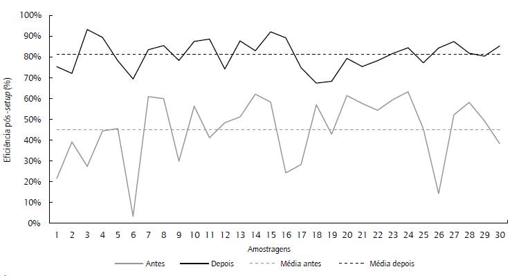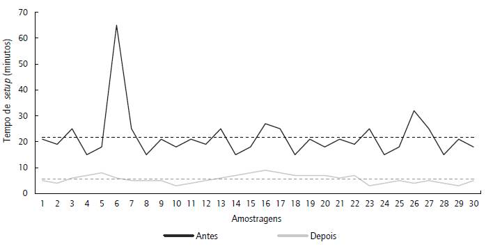Essas melhorias reduziram o tempo de setup em 74%. Nas 30 amostragens antes, a média de tempo de setup era de 21,8 minutos. Nas 30 amostras seguintes, feitas após a TRF, o tempo de setup reduziu para 5,6 minutos em média, conforme demonstrado na figura 10. Percebe-se que, na amostragem 6, ocorreu um outlier, pois houve quebra de uma máquina essencial ao novo modelo de calçado em meio à troca de setup, mesmo assim, foi mantida a informação no gráfico.
