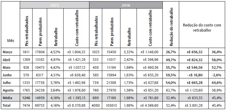 Nota-se que, no mês de junho de 2016, o custo com retrabalho não reduziu, todavia o índice de retrabalho manteve a tendência de queda. Uma razão para isso é que, em junho de 2015, a empresa concedeu férias coletivas aos seus colaboradores, apresentando uma diminuição significativa na produção de pares de calçados. Dessa maneira, houve uma redução média de R$ 633,55 a cada mês e, no total dos seis meses, uma economia de R$ 3.801,28. Também se pode considerar que, com a redução do índice de retrabalho, a empresa ganhou maior confiabilidade ante o cliente.