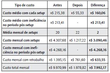 Após a aplicação da TRF, o tempo de setup foi reduzido, na medida em que a eficiência na hora pós-setup foi melhorada. A ineficiência foi calculada a partir do percentual que diferencia os dados antes e depois, ou seja, 36%. Considerando o custo para esses indicadores e para o retrabalho, de acordo com a média de setups realizados por mês, foi possível perceber uma diferença mensal de r$ 7.992,17. Portanto, houve uma redução monetária de 7,26% sobre o custo médio mensal, em torno de r$ 110.000,00 mensais, após a aplicação do conjunto de ferramentas que formulam a estratégia da manufatura desenvolvida.