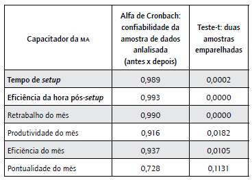 Os dados anteriores e posteriores às intervenções foram submetidos a testes estatísticos para validar a confiabilidade dos resultados. Foi utilizado o software spss, da IBM. Primeiramente, foi calculado o coeficiente de confiabilidade Alfa de Cronbach. Segundo Hair et al. (1999), o Alfa de Cronbach mede a consistência interna das amostras coletadas, em que o limite inferior de validação aceitável é 0,7. Todos os resultados do coeficiente de confiabilidade confirmaram a confiabilidade dos resultados pois todos os valores de Cronbach mostraram-se superiores a 0,7. Adicionalmente, os dados foram analisados pelo Teste-t para duas amostras emparelhadas, o qual testa a diferença entre itens em momentos distintos. Conforme Martins e Domingues (2011), o Teste-t necessita alcançar um nível de significância abaixo de 0,05 (5%) para rejeitar a hipótese de igualdade das médias das amostras (tabela 4). Nota-se que o resultado do Teste-t para a pontualidade no mês está acima de 0,05. Portanto, é possível sugerir que há semelhança entre as médias das amostras correlacionadas. Enquanto para os demais indicadores, é possível considerar que a médias das amostras são estaticamente diferentes.