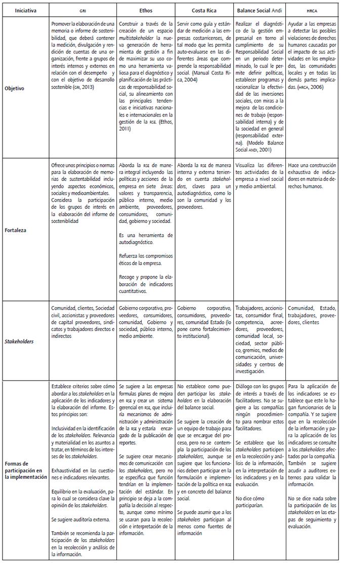 Al revisar los objetivos y principios normativos de los cinco estándares analizados (tabla 1) se encuentra una heterogeneidad en su orientación conceptual. Así, el estándar GRI habla de desarrollo sostenible; los de la ANDI y Costa Rica usan una noción de responsabilidad social que enfatiza la compatibilidad entre el desarrollo social y la rentabilidad de la empresa; el estándar Ethos emplea una concepción procedimentalista de la responsabilidad social empresarial; y el estándar HRCA se centra en el respeto y promoción de los derechos humanos.