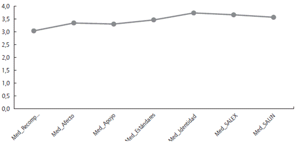 Se observa que el factor del CO con mejor percepción por parte de los empleados encuestados es el referente a los aspectos valorados para el componente de identidad organizacional (gráfica 1), mostrando este constructo una media cercana a 4 que, de acuerdo con la escala de valoración usada, corresponde a una percepción más positiva de los trabajadores en los aspectos que aglutina este factor. El 84% de los encuestados manifiesta que está orgulloso de formar parte de su organización; el 64% señala que el personal tiene mucha lealtad hacia la organización y el 67% expresa que les resulta posible conciliar los objetivos personales con los de la organización.