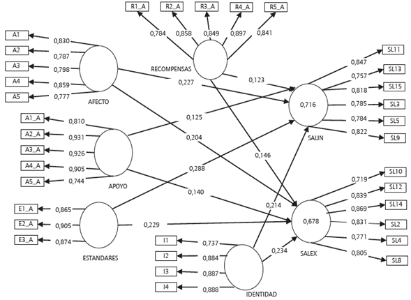 Además, en relación con los resultados de predicción, se identificó que se obtienen valores sustanciales del R2, al determinarse para las variables dependientes que SALEX es explicada por el modelo en un 67,8% y SALÍN, en un 71,6%. En relación con el indicador de f2, que mide los efectos de una variable independientes en una variable dependiente, mediante el cambio que se produce en el R2 del constructo endógeno, se observaron efectos pequeños en la presente investigación de las variables independientes (afecto, identidad, recompensas, estándares) sobre las dependientes (SALEX y SALÍN), puesto que se obtuvieron valores superiores a 0,02 y menores a 0,15.