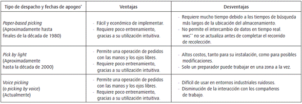 *Además de estos tres tipos de despacho, actualmente existe otro conocido como Picking by vision, que no es analizado aquí. Este utiliza la realidad aumentada (AR) para respaldar el proceso de despacho. Los operadores usan una pantalla montada en la cabeza (HMD) o gafas tecnológicamente modificadas que contienen una lente compatible con realidad aumentada y se superponen al mundo real con objetos virtuales (Haase & Beimborn, 2017; Guo et al., 2014). **wims es la sigla en inglés para "Sistema de Gestión del Almacenamiento" (Warehouse Management System). Fuente: adaptada de Haase y Beimborn (2017).
