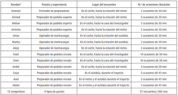 El trabajo de campo incluyó dos pasos metodológicos. Durante la etapa de observación participante no se llevó a cabo ninguna entrevista formal, principalmente para privilegiar la observación directa sobre la indirecta e impedir al máximo que los observados se sintieran interrogados (cf. Bermúdez, 2017; Emerson, Fretz, & Shaw, 2010). Sin embargo, durante tal etapa de observación se decidió, a manera de "hibridación metodológica" (Barbier, 2016; Fereday & Muir-Cochrane, 2006), la recolección de información a partir de 57 encuentros informales entre el investigador y sus "compañeros de trabajo", tal como se detalla a continuación3.