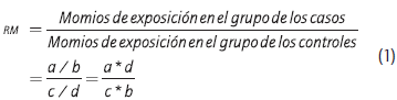 Los momios de exposición en el grupo de los casos son a/b, y los momios de exposición en el grupo de los controles son c / d. Así se obtiene la razón de momios (representada por las siglas RM).