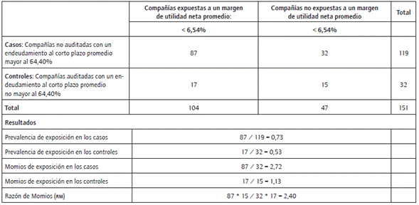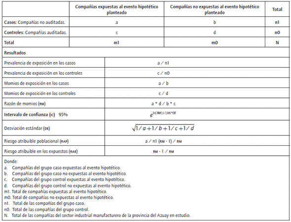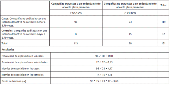 Para medir y reconocer los indicadores financieros claves de evaluación en el sector industrial manufacturero se utiliza el método caso-control sin pareamiento, que se basa en la tabla tradicional de 2 x 2, que permite calcular los momios con la finalidad de "expresar la posibilidad de ocurrencia de un evento de interés o de presencia de una exposición" (Cerda, Vera, & Rada, 2013, p. 1329) de los grupos caso y control (Londoño, 2014).