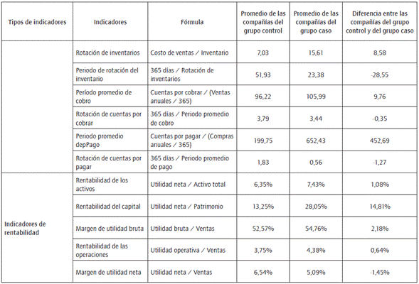 Para el análisis financiero se aplicaron 23 indicadores financieros, tanto a las compañías del grupo control como a las compañías del grupo caso. Los indicadores aplicados son liquidez corriente, razón rápida (prueba ácida), razón del efectivo (súper ácido), razón del inventario a pasivo corriente, estructura de capital, nivel de endeudamiento del activo total, nivel de propiedad del activo total, endeudamiento a corto plazo, endeudamiento a largo plazo, rotación del activo total, rotación del activo no corriente, rotación del activo corriente, periodo de inventarios, rotación del inventario, periodo promedio de cobro, rotación de cuentas por cobrar, periodo promedio de pago, rotación de cuentas por pagar, rentabilidad de los activos, rentabilidad del capital total, margen de utilidad bruta, rentabilidad de las operaciones, margen de utilidad neta.
