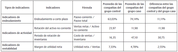 Los resultados del análisis financiero comparativo de los promedios de los indicadores de las compañías del grupo control y de las compañías del grupo caso permitieron obtener las siguientes observaciones: