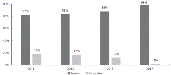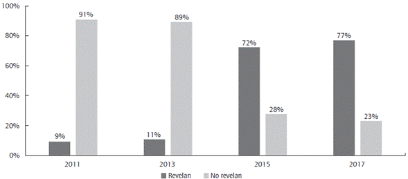 Para el periodo de aplicación de los IFRS, el porcentaje de empresas que revelan estas informaciones aumenta al 88% en el 2015, y es de cerca del 98% para el 2017, un incremento considerable de la divulgación de información financiera en la óptica de la armonización material de las prácticas contables, especialmente en el sector industrial que era el que menos divulgaba esta información, al pasar del 77% de las empresas en el 2011 al 97% en el 2017. En las demás áreas de la economía se alcanzan porcentajes similares.