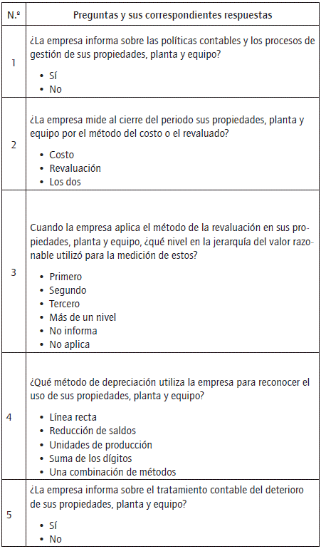 Posterior a la recolección de los estados financieros, se elaboró una matriz con un conjunto de cinco preguntas sobre el rubro de propiedades, planta y equipo, que fueron las guías con las que se elaboró la lectura y el análisis del contenido de las políticas contables de las empresas y la medición y la revelación del citado elemento. En la tabla 2 se presentan las posibles respuestas estandarizadas.