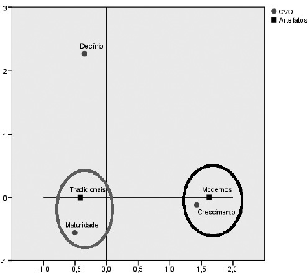Na figura 1, percebe-se que há proximidade entre as categorias da variável "ciclo de vida organizacional" com as categorias da variável "artefatos", o que gera dois agrupamentos distintos e revela a relação existente entre tais variáveis. Nota-se que um dos agrupamentos, formado no mapa perceptual, refere-se à aproximação da categoria "crescimento" com a categoria "modernos", o que indica que há uma correspondência entre a utilização de artefatos modernos e as empresas que se encontram em fase de crescimento, do modelo de Anthony e Ramesh (1992).