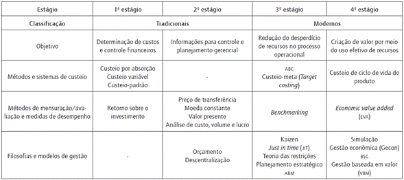 A tabela 1 sintetiza alguns artefatos de contabilidade gerencial e sua classificação conforme o estágio evolutivo a que pertencem. Ressalta-se que a classificação dos artefatos em cada estágio considera primordialmente as características e objetivos do artefato, e não sua data de criação. Assim, pode haver artefatos relativamente novos, mas que, em função de seus objetivos, sejam classificáveis nos estágios iniciais de evolução da contabilidade gerencial.