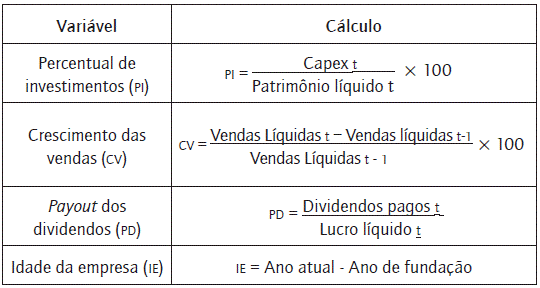 Para identificar o estágio de ciclo de vida de cada uma das empresas da amostra, utilizaram-se os quintis das proxies percentual de investimentos, o crescimento das vendas, payout dos dividendos e a idade da empresa. Conforme mencionam Lima et al. (2015), é necessário empregar múltiplas variáveis para minimizar o viés de se ter apenas uma variável, o que aumenta a segurança do método. As proxies foram calculadas conforme a tabela 3.