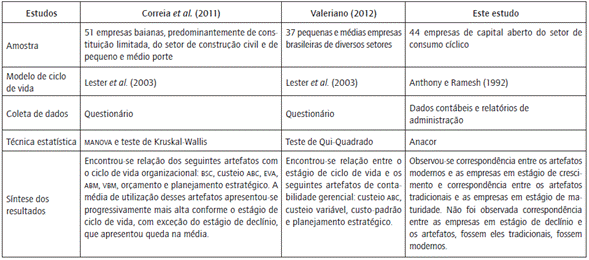 O estudo de Valeriano (2012) teve por objetivo investigar a relação existente entre os estágios de ciclo de vida organizacional e os artefatos da contabilidade gerencial adotados pelas pequenas e médias empresas que mais cresceram no Brasil, no período de 2008 a 2010. O modelo de ciclo de vida utilizado foi o de Lester et al. (2003). Por meio da aplicação de um questionário, em que o autor obteve 37 respostas, foi possível concluir que quatro artefatos, dentre os 12 investigados, apresentaram relação com o estágio do ciclo de vida, sendo eles: custeio ABC, custeio variável, custo-padrão e planejamento estratégico.