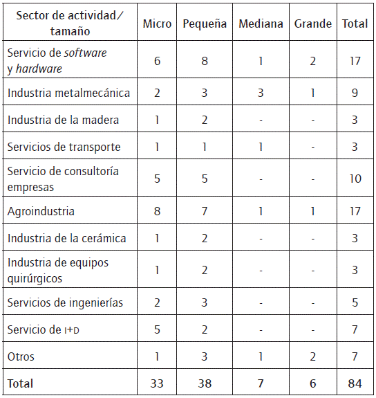 En total, el cuestionario contenía 27 preguntas y, en un primer momento, fue testeada en su contenido y estructura mediante una prueba piloto con 10 empresas, tras lo cual fue validada por expertos nacionales e internacionales. Después de ello, las encuestas fueron enviadas vía online y por correo postal, obteniéndose una muestra final de 84 empresas (tabla 1) y una tasa de respuesta del 78%.