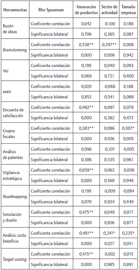 Todas las herramientas mencionadas en el estudio: buzón de ideas, brainstorming, TRIZ, AMFD, encuesta de satisfacción del cliente, grupos focales, análisis de patentes, vigilancia estratégica, roadmapping, simulación y diseño, análisis costo-beneficio, y target costing, fueron incluidas en el cuestionario (ya que son las más destacadas en la literatura) usando una escala tipo Likert de tres puntos, siendo 1 = no utilización, 2 = uso puntual y 3 = uso frecuente o sistemático.