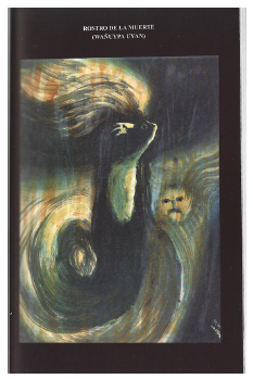 Para analizar este problema, nos situaremos en el poema "Wañuypa uyan/ Rostro de la muerte", ya que nos parece que la relación imagen-escritura presenta una condición expresiva especial. A diferencia del resto de las imágenes que acompañan el poemario, donde vemos los colores vivos del Ande y una representación figurativa realista y centrada desde la perspectiva, el óleo que acompaña este poema (Imagen 5) se centra en colores oscuros y fríos que van configurando figuras medianamente abstractas, circulares y onduladas que representan el espiral de la muerte, matizada por colores pálidos que permiten que la imagen presente un contrapunto en el espectro visual para resaltar las figuras de la muerte.