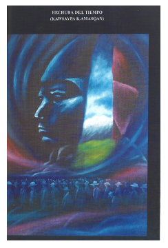 La visión de persistencia humana que plantea el poema se plasma en la imagen del tránsito de dos generaciones que caminan al alero del crepúsculo del Tata Inti, imagen del resurgimiento de un nuevo ciclo vital (Imagen 6). Algo similar sucede, por ejemplo, en "Kawsaypa kamasqan" o "Hechura del tiempo", poema que surge como una crítica a la violencia histórica sufrida por la "raza andina" y eleva un canto sobre la esperanza de su resurgimiento a partir de las matrices culturales propias. Se representa visualmente (Imagen 7) mediante una expresión de tristeza a través de los colores fríos; no obstante, la figura central es cortada por un rayo de luz del Tata Inti que recuerda la esperanza del pachakuty.14
