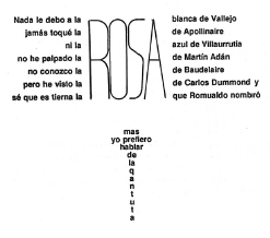 Finalmente, en la neovanguardia andina, la propuesta estética de José Luis Ayala constituye tanto un antecedente por la forma temprana en que comenzó a publicar textos experimentales como un estadio particular en la reflexión estética para este ámbito literario. Su poesía visual se inicia con Poesía para videntes (1988),19 un texto que funciona como un dispositivo semiótico que va tejiendo y anudando distintas tradiciones culturales, diseminando sentidos diversos que se basan en la complejidad de una subjetividad intercultural que opta por el mundo andino y que requiere de un lector ideal que pueda conjugar las coordenadas de sentido que se ponen en juego en el texto. Así lo vemos, por ejemplo, en el caligrama "Rosa", cuya visualidad recuerda al objeto lírico al que alude el texto. Aquí se observa claramente un sistema de preferencias, razón por la cual funciona como un metatexto, en el cual, frente a la imagen de la rosa, como símbolo de la perfección y lo absoluto en la poesía occidental, se opone la flor de la qantuta, símbolo del mundo andino en el poema.