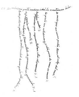 De igual manera, el poema "Q'iswachaka" (Imagen 10), alude al, por todos conocido, puente colgante inca tejido a mano en el Cusco sobre el río Apurimac, construido a base de fibra vegetal o ichu, que se renueva comunitariamente a través de la mink'a .18 La disposición de las palabras en el espacio de la página recuerda las líneas tendidas del ichu en el proceso de renovación de sus lianas, pero también recuerda la rápida corriente del Apurimac y las sinuosas montañas del Cusco, e incluso parece describir un quipu que nos incita con toda su sabiduría ancestral. En el poema, el puente se hace depositario de la cosmovisión, en la medida en que es una inmortalidad trenzada (al igual que los quipus), que permite ingresar al tiempo y espacio de las tres pachas donde prima la lógica circular del tiempo.