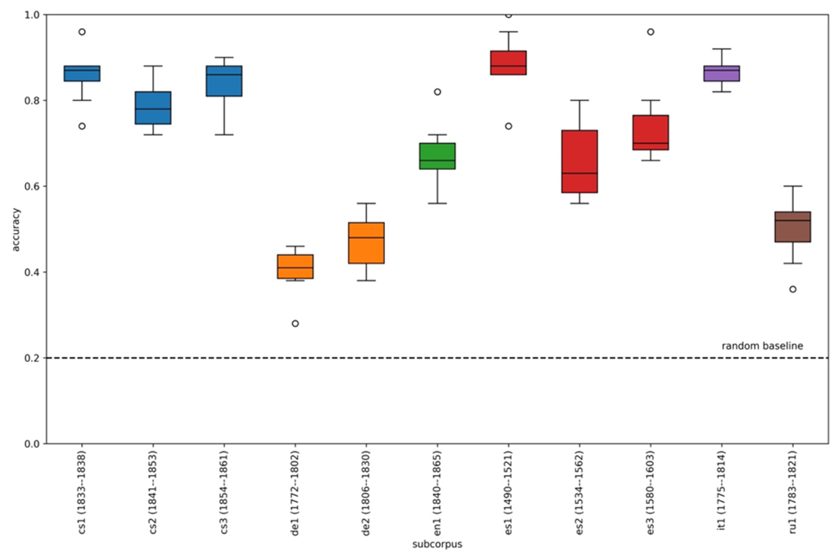 Figure 1 shows the results. All subcorpora significantly outperform the random baseline (0.2), yet there are substantial differences across languages.2 We hypothesize that one of the key factors may be the versification type: while in syllabic versification only the number of syllables in a line is constrained and the distribution of stress is left to the author’s preferences, in accentual-syllabic versification both syllable count and stress placement are subject to constraints, which leaves considerably less space for authors to individualize their rhythm.3