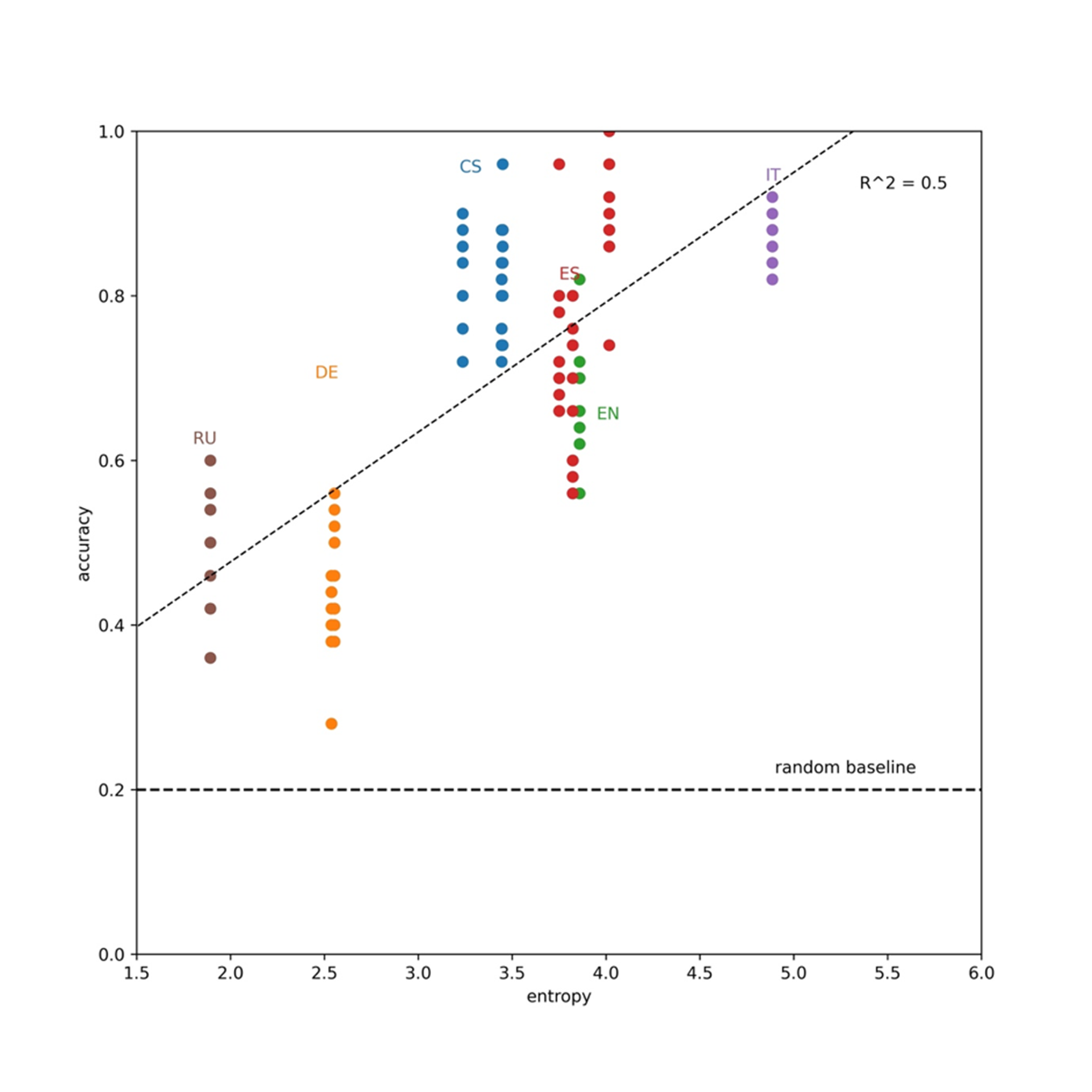 As Figure 2 shows, there is some sort of association between accentual regularity and the accuracy of authorship recognition as we proceed from strictly organized RU and DE; across semi-organized CS, EN, and ES; to loose IT, the accuracy tends to increase (linear regression, R 2 = 0.5).
