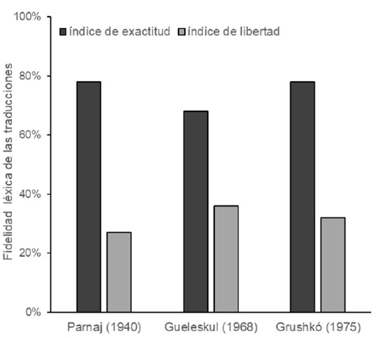 Como es evidente, un estudio cuantitativo léxico puede criticarse, pues considerar el número de palabras coincidentes no equivale a evaluar la exactitud del significado. Una frase traducida puede estar formada por elementos próximos, pero distorsionar por completo el significado del texto original, y, aun así, por medio de una metodología cuantitativa, ser considerada “exacta”. A esta crítica se podría responder que el número de estos casos en las traducciones es escaso, incluso, en las de mala calidad. Ahora, el obstáculo que no permitió la publicación del artículo de Fínkel fue la aversión característica de la época al análisis cuantitativo en los estudios literarios que se remonta a las luchas contra el formalismo de los años treinta. Tanto en el plano ideológico como investigativo, la preferencia por un enfoque adaptativo de la literatura en lengua extranjera, es decir, la firme convicción de que la traducción debe preservar el espíritu más que la letra de la obra, fue desafiada, aunque levemente, solo unos años más tarde, tras la muerte de Fínkel.