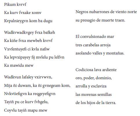 El Wallmapu, en tanto cuerpo en equilibrio que es arrancado de su estado inicial de armonía por la intervención extranjera, reacciona bajo la forma de fenómenos naturales que presagian el trastorno que se avecina. En este sentido, el comienzo del poema hace referencia a los negros nubarrones o "kurv fvxake xomv" y al "viento norte" o "pikum kvrvf", el cual es considerado en la cosmovisión mapuche como un viento destructivo que trae fuertes tormentas (Grebe 58), y que en este caso presagia la muerte. La transgresión del orden ancestral por una fuerza foránea provoca el desequilibrio que se manifiesta en una serie de imágenes las cuales aluden a un mundo no humano alterado, a la figura de la mapu como un ser maternal, y a sus hijos como coyvn, o "brotes" que son lastimados por la mano del colonizador.