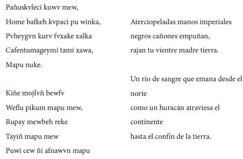 Además, mientras la versión castellana enfoca el tono denunciatorio en la violencia contra las mujeres, "las hijas de la tierra" cuyas vísceras son cortadas, el texto mapuche borra la referencia de género para hablar de coyvn o "brotes de la tierra" en el verso "tvfaci mapu ñi coyun". La imagen vegetal de los habitantes de la mapu como sus hijos-brote, vástagos que crecen sobre su superficie, es recurrente en el mundo mapuche y refiere a una estructura de igualdad entre todos los seres, humanos y no humanos, como deudores de su vida a la tierra y, a su vez, como sostenedores del equilibrio en la misma. Así lo ha explicado Elicura Chihuailaf en Recado confidencial a los chilenos: