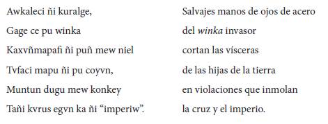 Mientras en castellano las manos del wingka invasor cortan las vísceras de las hijas de la tierra -introduciendo la imagen de una carnicería y de la violación de las mujeres-, la versión en mapudungun acomete a su contraparte castellana con los siguientes versos "kaxuñmapafi ñi puñ mew niel / tvfaci mapu ñi coyvn". Aquí reaparece el verbo cortar con kaxuñ (Augusta 78) pero se incluye una referencia explícita a la hablante lírica como testigo de los hechos violentos con la frase adverbial "ñi puñ mew", "delante mío, frente a mí" (Augusta 189). De esta manera, el poema intercepta un tiempo pasado y lo trae al presente enunciativo del texto poético como algo "más que el registro historiográfico" (Sánchez 32), un tiempo en latencia como memoria que guardan las fuerzas protectoras del Wallmapu y que revive ante los ojos de quien sabe vincular aquellos hechos de sometimiento con los actuales.
