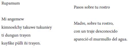 En el poema "Rupamum / Pasos sobre tu rostro" , que Leonel Lienlaf publica en su primer libro Se ha despertado el ave de mi corazón (54-55), el testimonio como "motivo fundante" (García Barrera, "Entre-textos" 37-38) se instala para referir el vínculo con el antepasado en un tiempo no lineal en el que este "es" también la generación vigente, donde el che (la persona) asume en su presente no solo su propio devenir histórico y espiritual sino también las experiencias y el "ser" de sus ancestros (37-38). El poema presenta una gran densidad de imágenes y juegos de palabras en los que el traful de la autotraducción puede verse en toda su complejidad y creatividad. No hay equivalencia semántica entre los títulos, en su lugar, ambos se complementan en el imaginario que el lector va reconstruyendo a lo largo del texto. Rupamum puede traducirse como "por donde se pasa", ya que incluye el verbo rupan, pasar (Augusta 203) y la marca de propósito mu. Esta referencia al tránsito y al pasaje no solo remitirá en el texto a un espacio, sino también al transcurso del tiempo como un itinerario que conecta a los ancestros con las generaciones actuales. Por esto es que el título en castellano, "Pasos sobre tu rostro", complementa esta idea al explicitar cuál es ese espacio que se recorre: el rostro de la madre, surcado por el tiempo, del que emergen otras caras, las de los antepasados, pero también la del propio sujeto poético y sus descendientes.